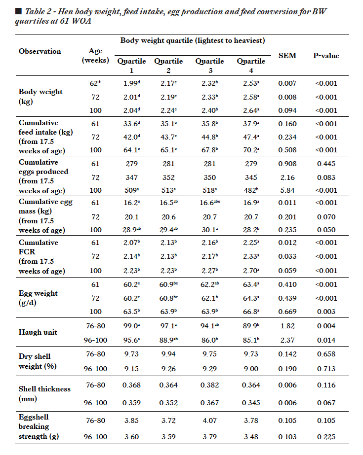 Commercial egg-laying hens that have incremental increases in body weight (BW) throughout the laying phase are prone to irregular persistency of lay and the production of large eggs with poor shell quality. They continue to accumulate abdominal fat through the laying cycle which typically ceases when they are 72-78 weeks of age (WOA). The table egg industry is moving towards extending the laying cycle until 100 WOA. In this study, the performance of Hy-line Brown hens, grouped based on BW, was assessed through to 100 WOA. The hens were housed in individual cages in a high-rise layer shed under 16 h light, with ad libitum access to feed and water from 17.5-100 WOA. They were retrospectively allocated to four BW quartiles at 62 WOA, i.e. quartile 1 (Q1), the lightest hens, BW 1.99 kg to quartile 4 (Q4), the heaviest hens, BW 2.53 kg. Hen BW and egg weight (EW) had been measured at 72 and 100 WOA and cumulative feed intake (FI), egg production (EP), cumulative egg mass (EM) and cumulative feed conversion ratio (FCR) were calculated for each BW Quartile from 17.5 WOA until 61, 72 and 100 WOA. Egg characteristics of Haugh unit (HU), relative dry shell weight, shell thickness and shell breaking strength were measured at 76-80 and 96-100 WOA. At 62, 72 and 100 WOA the BW of hens in each quartile were different with Q1 BW matching the breed standard BW for age. At 100 WOA, average BW was 2.04, 2.24, 2.40 and 2.64 kg for Q1, Q2, Q3 and Q4 respectively. Concurrently EW was 63.5, 63.9, 63.9 and 66.8 g; cumulative FI was 64.1, 65.1, 67.8 and 70.2 kg; cumulative EP was 509, 513, 518 and 482 eggs, cumulative EM was 28.9, 29.4, 30.1 and 28.3 kg, and cumulative FCR was 2.23, 2.23, 2.27 and 2.70 kg/kg respectively. At both 76-80 and 96-100 WOA eggs from Q4 birds were the heaviest but with the lowest HU. At 96-100 WOA the shell of eggs from Q4 hens was numerically (P=0.067) thinner than the eggshell of Q1-Q3 hens. There were no differences in relative dry shell weight nor eggshell breaking strength. These outcomes support management of egg-laying hens to maintain their BW at breed standard recommendation for age. i.e. Quartile 1. Compared to heavier hens, Q1 BW will achieve the most efficient production of good quality eggs.