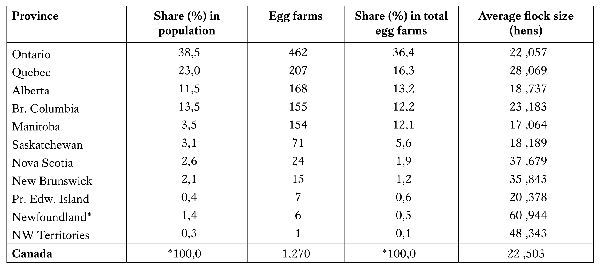 The differences in average flock sizes are striking. Farms in Newfoundland and Labrador and the Northwest Territories have the highest values, followed by farms in Nova Scotia and New Brunswick, which are located on the outskirts of urban areas. Here, too, farm sizes are well above the national average. In terms of production, they are geared to supplying the population of the province and the major cities of Quebec, including Montreal. The central provinces of Manitoba and Saskatchewan have the smallest farm sizes. The provinces of Alberta and British Columbia are more balanced in terms of population and egg-producing farms. Alberta’s farm size is similar to that of the eastern plains, while British Columbia’s is slightly above the national average.