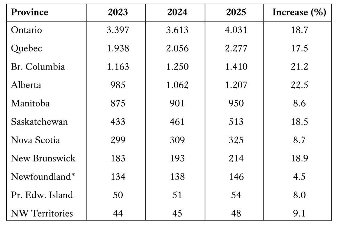 Another challenge is adapting the supply management system to population growth. Between 2019 and 2023, the population rose from 37.2 million to 38.8 million. A further increase to 39.6 million is forecast by 2025. The population is growing by around 400,000 people per year. Of this, 140,000 is due to natural population growth and 260,000 to immigration. Demand is therefore increasing by around 100 million eggs per year. It could increase even further if per capita consumption were to increase further. This development must be taken into account by adjusting the production quota and its distribution among the individual provinces. An annual increase of 335,000 hens with an average laying rate of 298 eggs per hen per year will be necessary. Table 6 shows the changed quota allocation for 2024 and 2025 compared to 2023. The quota allowed in 2025 will increase by 1.67 billion eggs, or 17.6%, compared to 2023 to meet the expected market demand. Ontario and Quebec will account for half of this increase. The relative change across provinces will vary considerably. The highest growth rate is estimated for Alberta at 22.5% and the lowest for Newfoundland and Labrador at 4.5%.