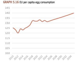 EU per capita egg consumption is projected to grow by +0.5% per year, reaching 14 kg per capita by 2035. Consumption trends are driven by the ease of preparation of eggs, their role as a relatively affordable source of protein, increased health awareness among consumers, and an ageing population, as older consumers tend to consume more eggs.