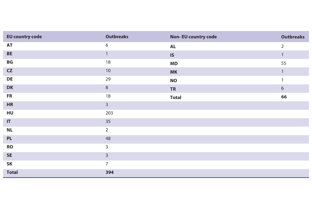 ADIS (Animal Disease Information System), the EU information system for animal diseases, recorded 394 outbreaks in EU countries and 66 in non-EU countries in 2024 (Table 1 and Figure 1). In detail, fifteen EU countries (Austria, Belgium, Bulgaria, Czech Republic, Germany, Denmark, France, Croatia, Hungary, Italy, Netherlands, Poland, Romania, Sweden, Slovakia) and six non-EU countries were affected (Albania, Iceland, Moldova, North Macedonia, Norway, Turkey).