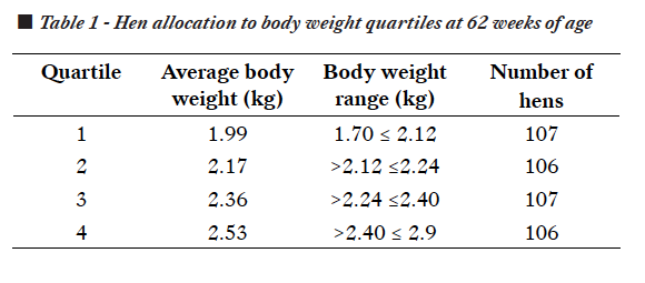 Data on hen performance and egg quality through an extended laying cycle of hens became available from a study that involved several lighting and feeding treatments during rearing (Muir et al., 2023b; Muir et al., 2024). Analysis of BW data when the hens were 62 WOA identified hens of a range of BW with each rearing treatment group. This presented an opportunity to explore the impact of differences in BW on performance and egg quality to the end of an extended laying cycle. The main study followed the original experimental design until hens were 100 WOA (Muir et al., 2024). Then, irrespective of their rearing treatments, the flock was retrospectively divided into four BW groups or quartiles (Q), based on BW at 62 WOA. The data were then analysed to assess the effect of hen BW in late lay on cumulative FI, EP, egg mass (EM), FCR and egg characteristics throughout an extended laying cycle.