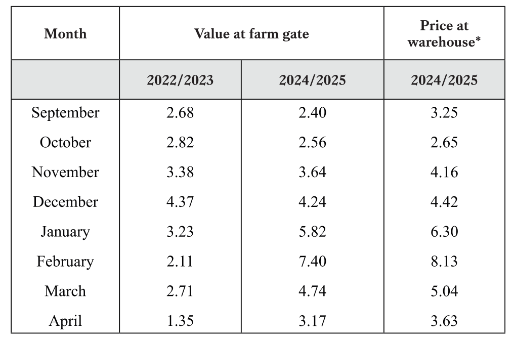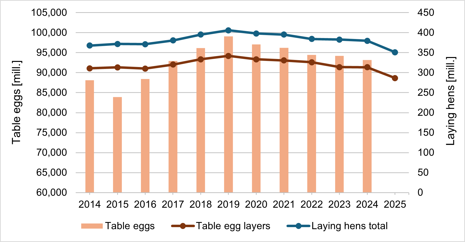 The farms had barely recovered from the outbreaks when the fourth epidemic in a decade began in October 2024. It led to the highest losses ever with over 50 million laying hens. From March 2024 to March 2025, the number of table egg layers fell by 11 million to just 283.3 million, the lowest level in over a decade. Production declined by around 6 billion eggs since 2019. The resulting shortage in the food retail sector led to an unprecedented price increase and made egg imports necessary in order to secure the population’s supply. Per capita consumption fell to just 271 eggs in 2024 due to the high prices. The decline in table egg layers continued until mid-2025, in June only 271.3 million hens were counted, and egg prices in food retail remained on a high level. Protests among the population made it necessary for the government to intervene. This will be discussed in a later section.