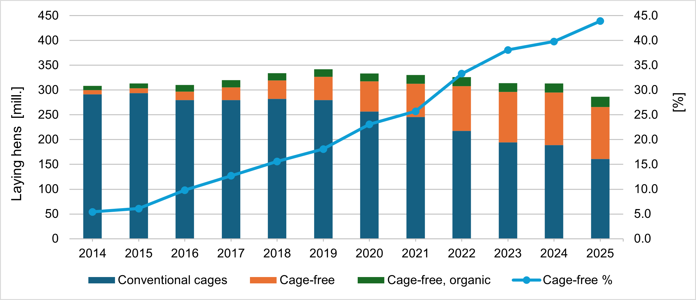The ongoing and initially very controversial debate about the ban on conventional cages for laying hens, which began in 2008 with Proposition 2 introduced by the Humane Society of the United States in California, will not be discussed in detail here (see Windhorst 2009). In the following years, further propositions were put to the vote and in 2012 Proposition 12 was approved in a referendum. Despite initial resistance and a very hesitant abandonment of conventional cages, the conversion to or construction of cage-free facilities gained momentum. The decisions of leading food retailers, hotel chains and egg processing companies to only sell or use cage-free eggs played an important role. In the wake of the Covid-19 pandemic and the AI epidemics, the switch to cage-free production accelerated. While only 16.1 million or 5.4% of laying hens were kept in cage-free systems in 2014, this value has already reached around 126 million or 43.9% by mid-2025 (Figure 3). It can be assumed that two thirds of all laying hens will be housed in cage-free systems by 2030. The emerging legislation regarding financial compensation for farms following an AI outbreak and the associated animal losses may also play a decisive role here.