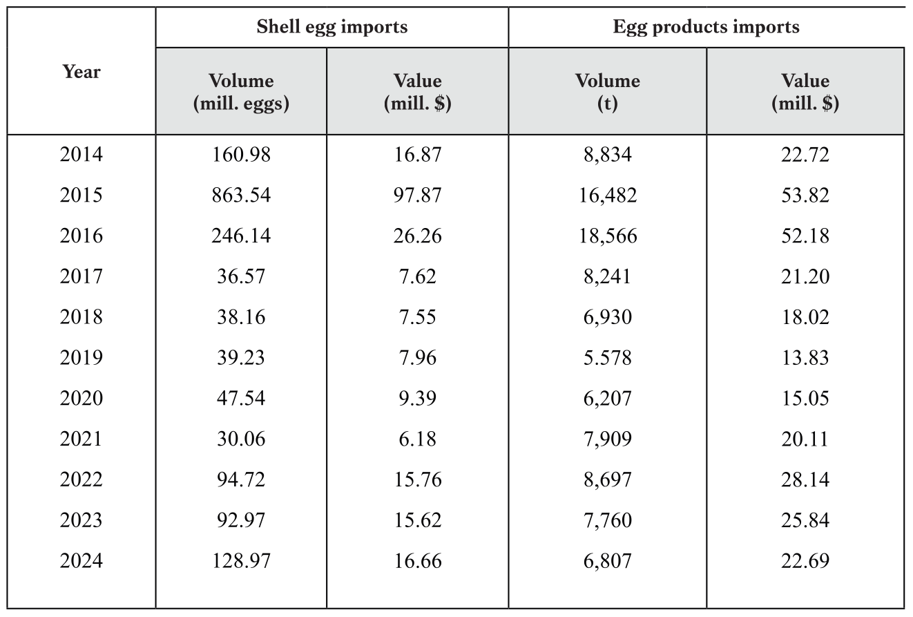 In the urban agglomerations of the north-east and in California, retail prices were at times as high as $10 a dozen. This led to protests among the population and forced the government to react. The egg products industry in particular had problems delivering the quantities it had contracted for because it was unable to obtain the eggs it needed, or could only do so at a much higher price. Like some grocery chains, it pushed to import eggs in order to be able to continue producing at a cost-covering level. Because the AI outbreak in 2015 caught laying hen farmers unprepared, the supply deficit was particularly high. Between the end of 2015 and the beginning of 2016, over 1.1 billion eggs worth $124 million and 35,000 t of egg products worth $106 million were imported. Although imports were lower regarding the volume after the epidemics of 2022 and 2023/24, they reached a total value of $124.7 million (Table 3).