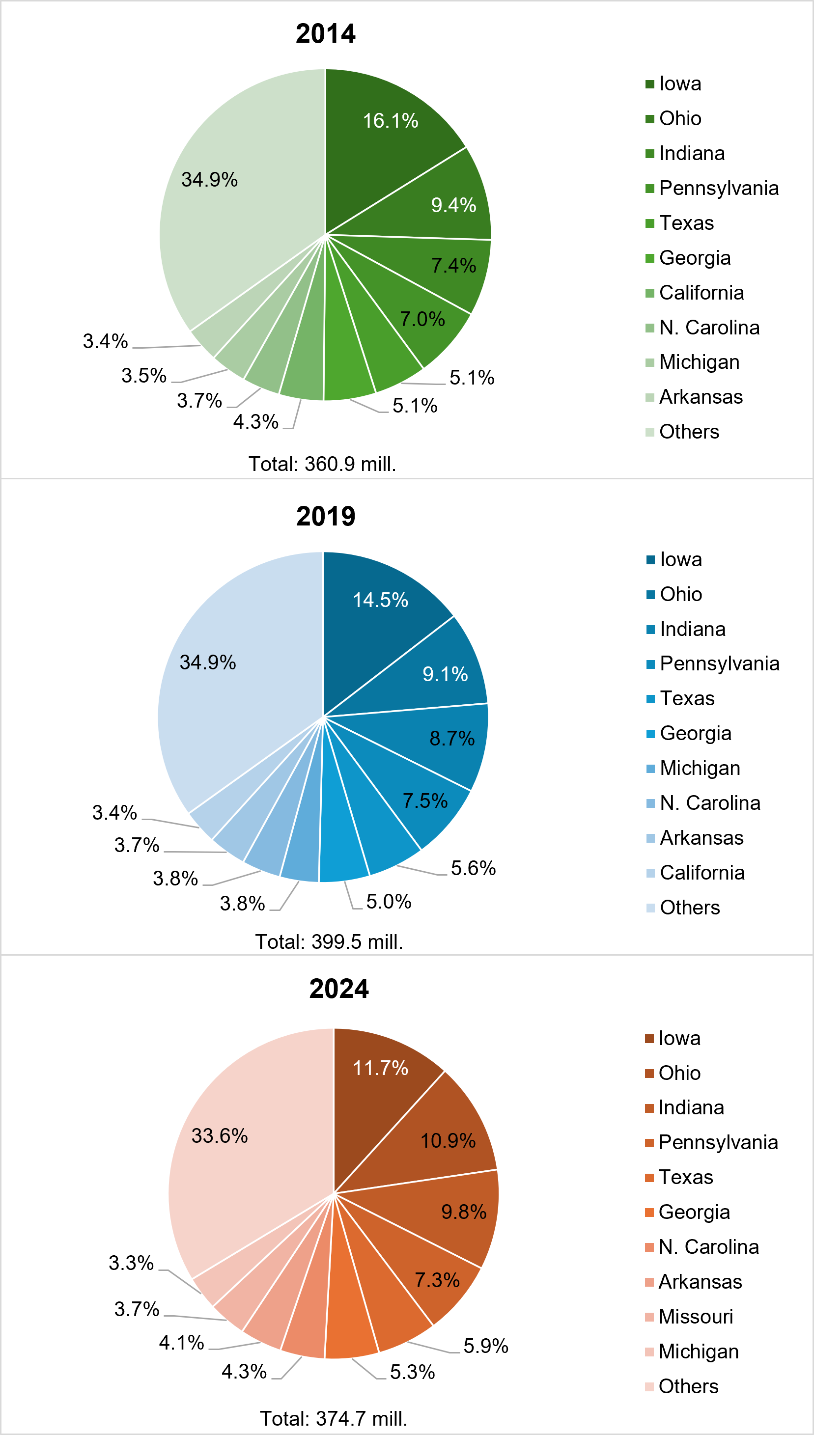 A comparison of the ten leading states in their laying hen inventories in 2014, 2019 and 2024 shows (Figure 2) that Iowa lost its dominant position. Between 2014 and 2024, the number of laying hens fell from 59.2 million to 43.8 million, or by 26.0%. The share in the total U.S. hen inventory fell from 16.4% to 11.7%. In contrast, the number of hens in Ohio rose from 29.1 million to 40.7 million, or by 39.2%, and the state’s share in the total inventory increased from 8.1% to 10.8%. Indiana showed a similar dynamic. The big loser was California, whose share in the U.S. table egg layer inventory declined from 2.7% to just 1.4% between April 2014 and April 2024. Like Ohio, California was particularly hard hit by the 2024/25 epidemic. Between April 2024 and April 2025, California lost 4.1 million table egg layers and is no longer one of the leading states. It will take several years to rebuild the flocks. Whether the previous status can be achieved again is an open question.