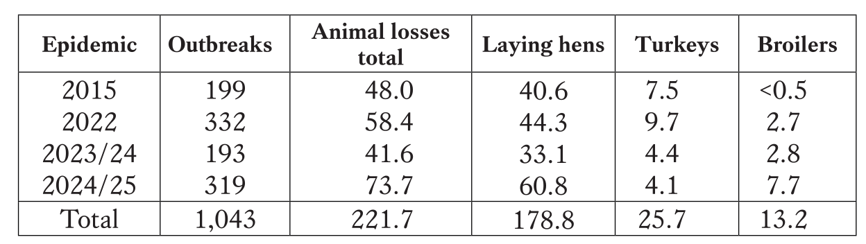 Between December 2014 and July 2025, the U.S. poultry industry has been hit by four devastating outbreaks of avian influenza (AI). In total, the highly pathogenic AI virus (HPAI) was diagnosed on 1,043 commercial poultry farms (1,932 total farms including backyard flocks). A total of 221.7 million poultry died due to virus infections or preventive culling. Of these, 178.8 million were laying hens, 25.7 million turkeys and 13.2 million broilers (Table 1). In this article, the temporal and spatial spread of the disease, its economic impact on egg production and the responses of the industry and the government are analysed.