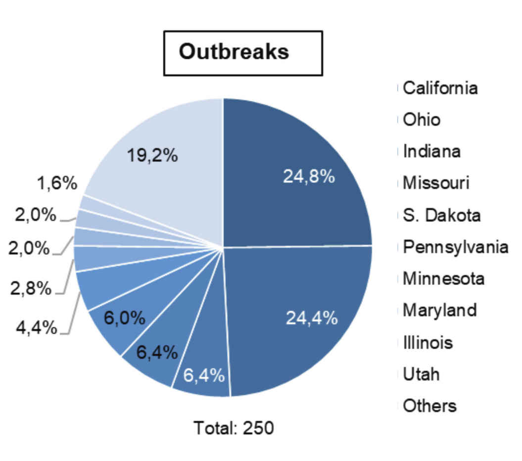 Figures 2 and 3 show the ten states with the highest number of infected farms and animal losses. Figure 2 reveals that out of a total of 250 registered HPAI virus infections in commercial poultry flocks (excluding small flocks), California and Ohio alone accounted for 123 respectively 49.2%. The regional concentration of losses was similar. Again, California and Ohio accounted for 49.2% (Figure 3). The shares of the two states during the winter 2023/24 epidemic were similar at 49.0% (Windhorst 2024). The epidemic in 2022 differed significantly from the following two, as the northern Midwest was mainly affected and the regional concentration was significantly lower (Windhorst 2023).