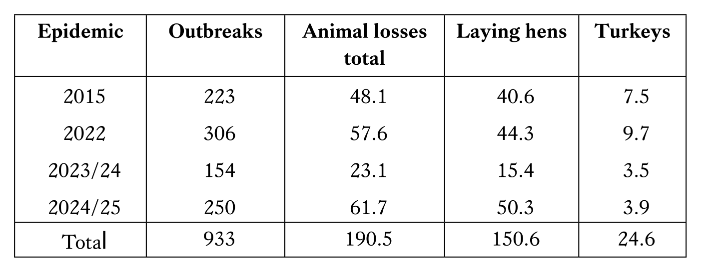 Between April 2015 and April 2025, the highly pathogenic AI virus (HPAI) was diagnosed on 933 farms. A total of 190.5 million poultry died due to virus infections or preventive culling. Of these, 150.6 million were laying hens and 24.6 million turkeys (Table 1).