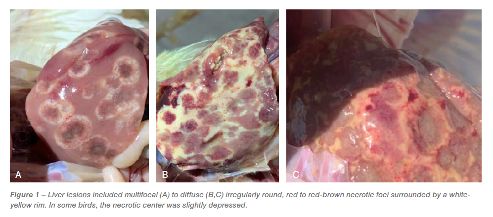 A presumptive diagnosis of histomoniasis was made based on the characteristic gross lesions in the ceca and liver. In this case, the liver lesions were distinctive suggesting histomoniasis. In some instances, H. meleagridis does not cause typical lesions in the liver. In other instances, the liver and cecal lesions may be induced by different pathogens. Lesions in the chicken liver can be induced by parasites such as H. meleagridis, Tetratrichomonas gallinarum and Leucocytozoon caulleryi, viruses such as Marek’s disease virus, Avian leukosis virus, reticuloendothelial virus, fowl adenovirus-1, avian hepatitis E virus and bacteria such as Salmonella pullorum, Salmonella gallinarum, Pasteurella multocida, Mycobacterium avian, Enterococcus cecorum, Streptococcus gallolyticus subsp. gallolyticus, Escherichia coli (perihepatitis), Mycoplasma gallisepticum (perihepatitis), Mycoplasma synoviae (perihepatitis), Clostridium perfringens, Camplylobacter hepaticus, Staphylococcus, and Erysipelothrix rhusiopathiae. Other conditions that can cause liver lesions include hemorrhagic hepatopathy, fatty liver hemorrhagic syndrome, aflatoxins, amyloidosis, ascites, visceral gout, heat stress and high energy diet. Lesions in the chicken ceca can be induced by parasites such as H. meleagridis, Eimeria tenella, Tetratrichomonas gallinarum and bacteria such as Salmonella sp. Combined liver and cecal lesions in chickens can be induced by H. meleagridis, Tetratrichomonas gallinarum and Salmonella Sp.