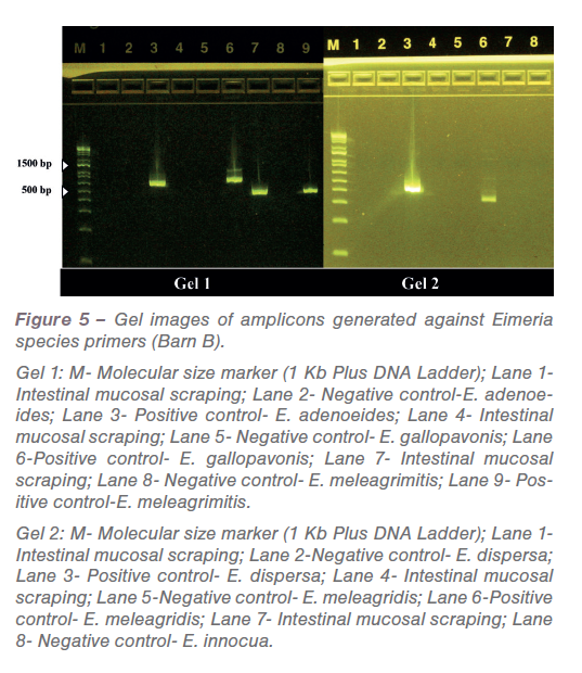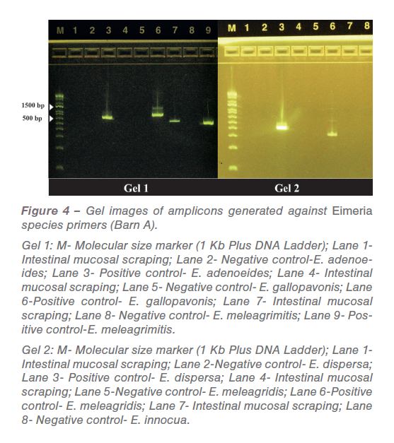 In low-grade infections the pathological manifestations are not pronounced. Also, in field conditions all turkeys are not challenged at the same time and the dose varies based on oocyst consumption. PCR was performed against common turkey Eimeria species based on previously published primers. The amplicons generated from PCR reactions (Figure 4 and 5) were sequenced, analyzed and confirmed as E. meleagrimitis.