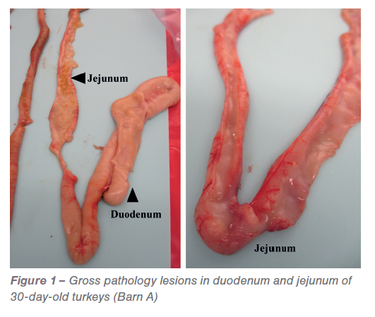 Overall, most of the turkeys examined in both barns did not have any gross lesions associated with coccidiosis. Only a few turkeys in Barn A had abnormal contents with fluid and mucoid contents in the duodenum and jejunum (Figure 1).