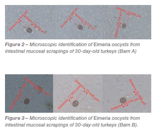 Seven Eimeria species have been described in turkeys and each Eimeria species targets specific regions of the intestine. In field conditions, turkeys consume sporulated oocysts in the litter, which replicate and then numerous unsporulated oocysts are shed in the feces. The oocysts shed in the feces may be screened at regular intervals to monitor the oocyst load in turkey barns. Surveillance of Eimeria species in the turkey flock helps in understanding the oocyst load as well as to speciate the circulating strains on farm premises. In February 2023, an increased number of oocysts were detected in 30-day-old turkeys raised in two conventional barns (Barn A and B), USA. As a part of the field investigation, a few turkeys were necropsied and studied. Although gross lesions were noticed in few birds from Barn A, most of the turkeys in both barns did not have any gross lesions associated with coccidiosis. On mucosal scraping, Eimeria oocysts were detected in both barns and confirmed as E. meleagrimitis by PCR and sequencing.