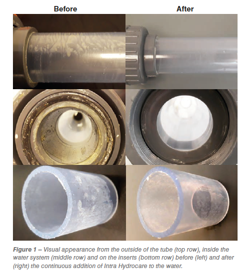 Traditional disinfectants, like chlorine, may disinfect the water, but form harmful residues and/or negatively affect the taste of the water. Intra Hydrocare is a silver-stabilized hydrogen peroxide solution that disinfects the water and also physically removes the biofilm from the inner lining, without residues and taste changes. Due to its unparalleled stability, Intra Hydrocare remains active from the beginning of the water line until the last nipple. Its addition to the drinking water guarantees that the water will remain free of microorganisms and no biofilm will build up in the water system. The functionality of Intra Hydrocare has proven itself around the globe in the most varying practical conditions, the study described in this article clearly visualizes its functionality under experimental test conditions.