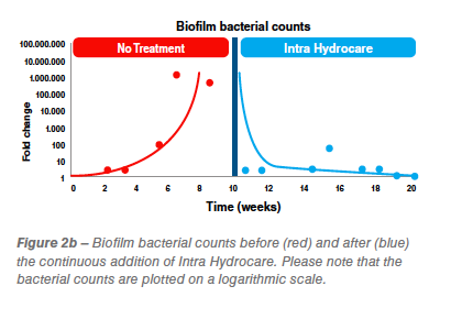 The ATP measurements are in line with the bacterial counts from the inserts, which rapidly increased within 6 weeks (Figure 2b) to an almost two million-fold (1.9 x 106) increase. The subsequent continuous addition of Intra Hydrocare quickly resulted in a two million-fold (log 6) decrease, demonstrating the fast and effective removal of microbiological contamination from the surface of the inserts and inner lining of the tubes.