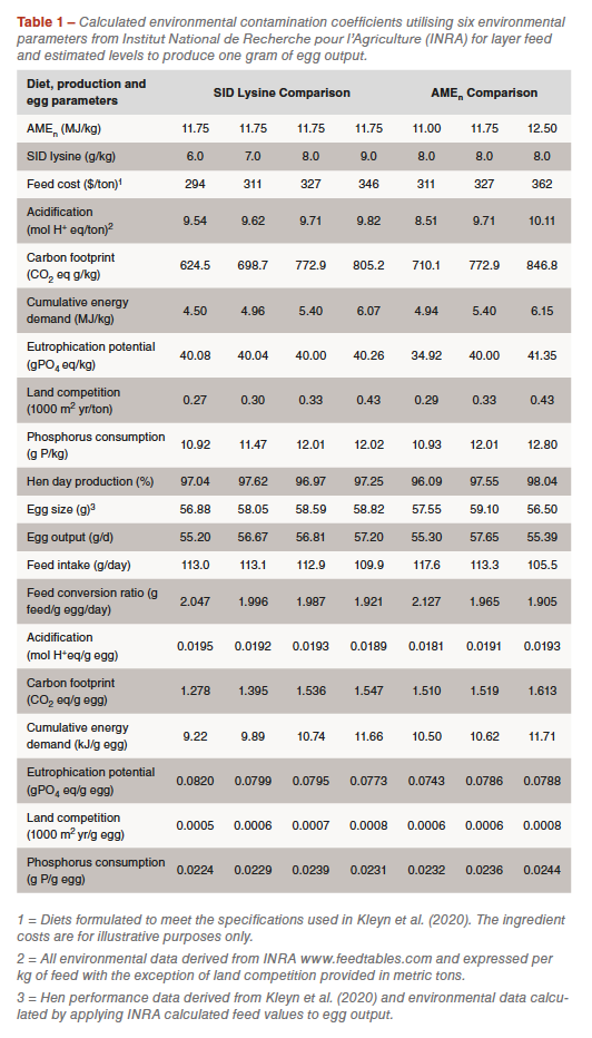 This paper reports an evaluation of diets and and egg output using field performance data from individually housed Hy-Line Brown hens, calculated by applying six environmental parameters assessed for individual feed ingredients by Institut National de Recherche pour l’Agriculture (INRA). A modelling exercise allowed for the determination of the environmental impact of layer diets.