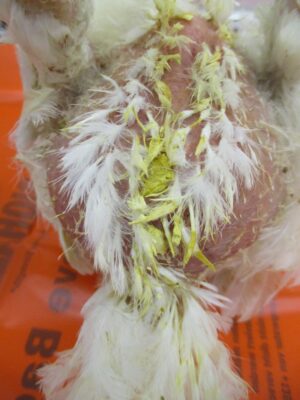 The classic liver lesions induced by H. meleagridis aid in differentiating histomoniasis from coccidiosis. It may induce necrotic foci in the liver (Figure 8A) or pin-point white foci (Figure 8B). Sometimes, liver lesions in chickens may not be as severe and spectacular as in turkeys. H. meleagridis infection in chickens may cause severe cecal lesions without inducing any liver lesions. Severe liver degeneration and damage to the bile duct may result in yellow-colored droppings which result in yellow smear around the vent region (Figure 9). In some cases, H. meleagridis outbreaks may go unnoticed due to the lack of clinical signs or characteristic gross pathology lesions (9).