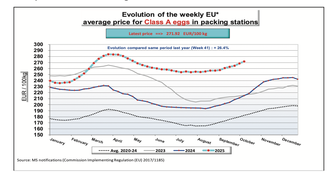 In week 41 of 2025, the average EU price for Class A eggs in packing stations was €272/100 kg, which is 4% higher than last month, 26% above the same week in 2024, and 49% higher than the five-year average.