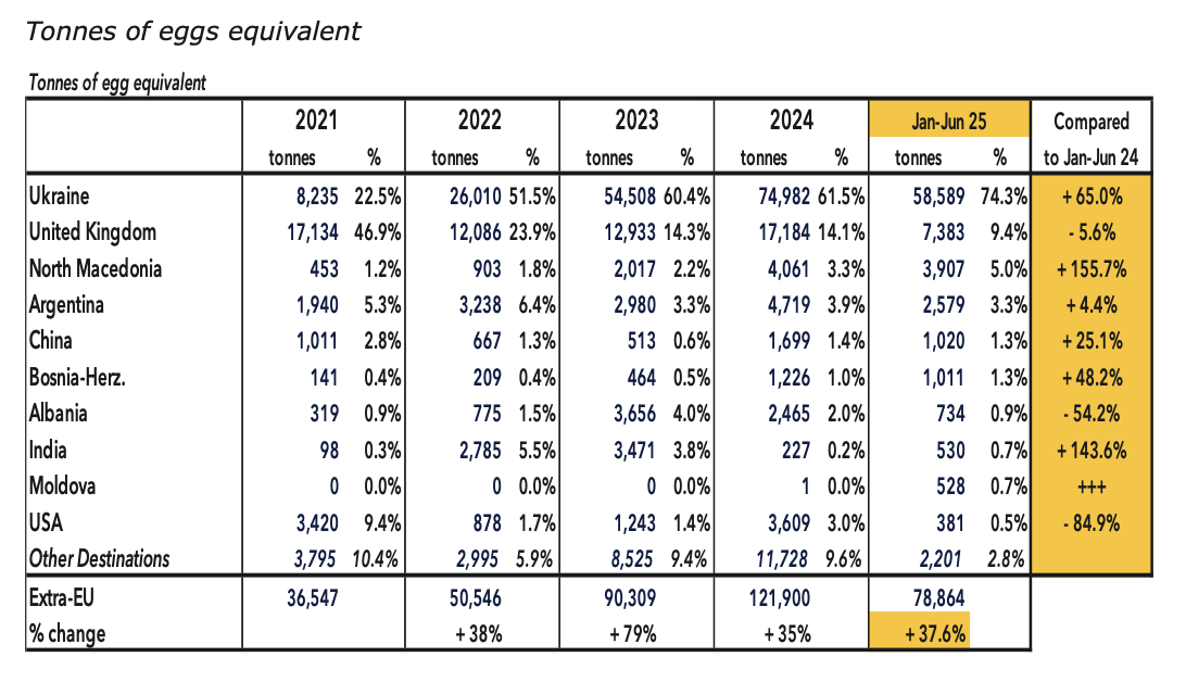 Between January and June 2025, EU egg imports increased by 37.6 % in volume and 50 % in value compared with the same period in 2024.