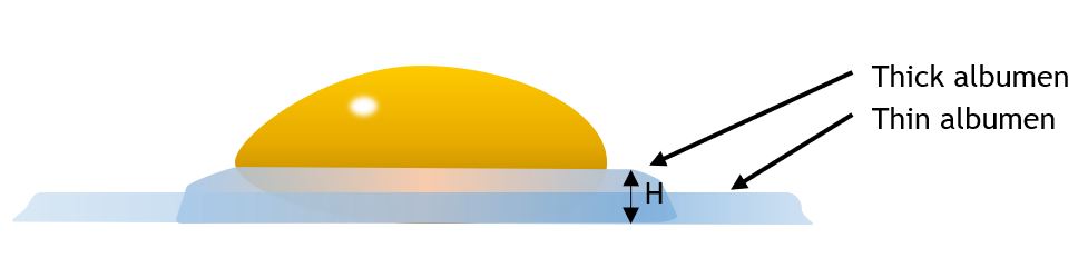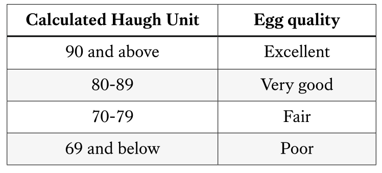 The albumen (egg white) provides essential proteins for the developing embryo. It also protects the embryo from any bacteria that could get into the egg. The most common test for albumen quality — conducted during a fresh egg breakout analysis — was invented by Raymond Haugh. After weighing, an egg is broken onto a flat surface. A micrometer caliper is used to determine the height of the albumen surrounding the yolk. The height, correlated with the weight, determines the Haugh Unit. The higher the number, the better the albumen quality of the egg (Table 1).