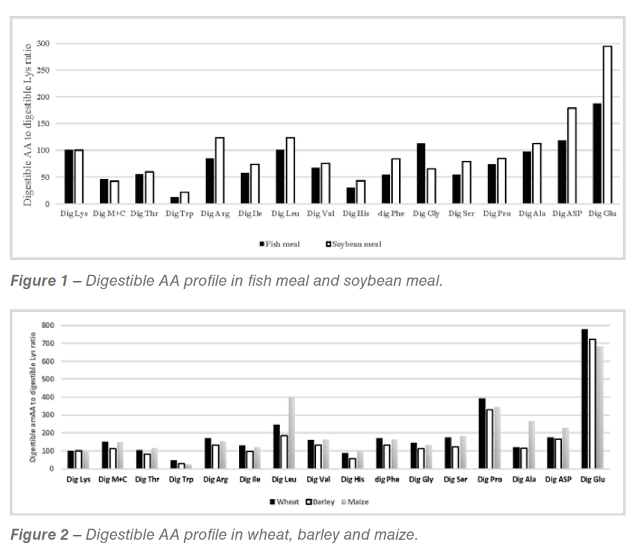 (CP) which produces a variety of extracellular toxins and invasive enzymes in the broiler chicken gut. It is widely believed that coccidiosis, wheat or barley-based diets with a high proportion of fish meal and removal of in-feed antibiotics are major disposing factors. Due to a damaged intestinal mucosa, subclinical NE usually results in poor body weight gain associated with reduced feed intake, and it is assumed that needs for some functional amino acids for immunity will be met by mobilizing skeletal muscle protein. Compared to soybean meal, addition of fish meal might result in deficiency in arginine (Arg), leucine (Leu), isoleucine (Ile), aspartic acid (Asp), histine (His), phenylalanine (Phe) and glutamic acid (Glu) (Figure 1, adapted from Lemme et al., 2004). Compared to maize, use of wheat or barley might lead to a diet deficient in alanine (Ala), Leu and Asp (Figure 2, adapted from Lemme et al., 2004). Adding Arg has been demonstrated to reduce intestinal mucosal disruption during a coccidial challenge. Leu, Ile, Asp and Glu play vital roles in the metabolism and function of leucocytes and lymphocytes. Glutamine is important for maintaining the integrity of the gut barrier and the structure of the intestinal mucosa. Increasing total methionine levels from 0.35 to 1.2% in the diet of chickens infected with Newcastle Disease virus markedly enhanced immune responses: T-cell proliferation, plasma IgG levels, leucocyte migration and antibody titres. Furthermore, threonine (Thr), Arg and Glu may help to minimize over-activation of the innate immune system and modulate the intestinal microbiota. It is noteworthy that, although amino acids are required for the synthesis of a variety of specific proteins to sustain normal immunocompetence and protect the animal from a variety of diseases, an imbalanced supply of amino acids in the diet can be deleterious to the immune system.