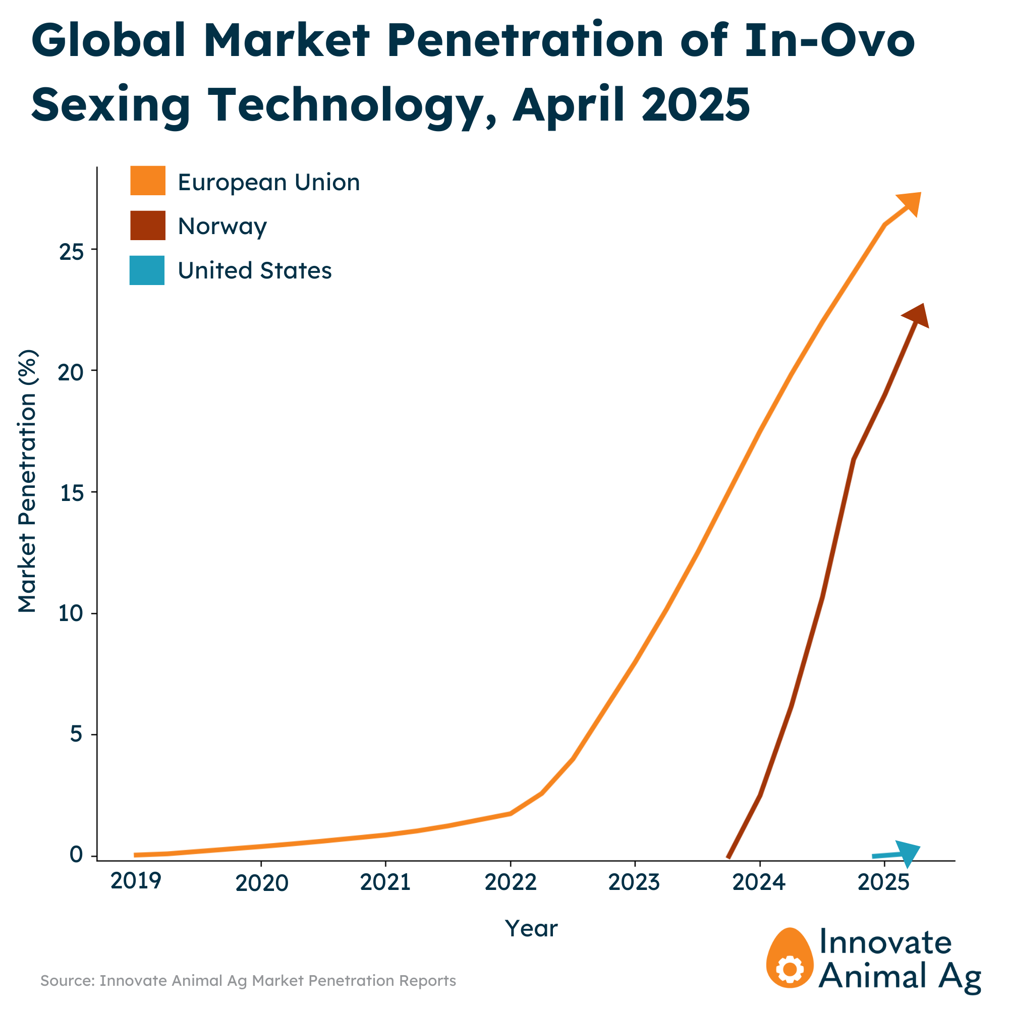 The technology is now widespread in Europe. Original research by Innovate Animal Ag indicates that over 110 million of the 393 million head EU layer flock were sexed in-ovo, a 28% market penetration. In addition to the upcoming ban on chick culling in Italy in 2027, there is also discussion of EU-wide regulatory action on the topic.