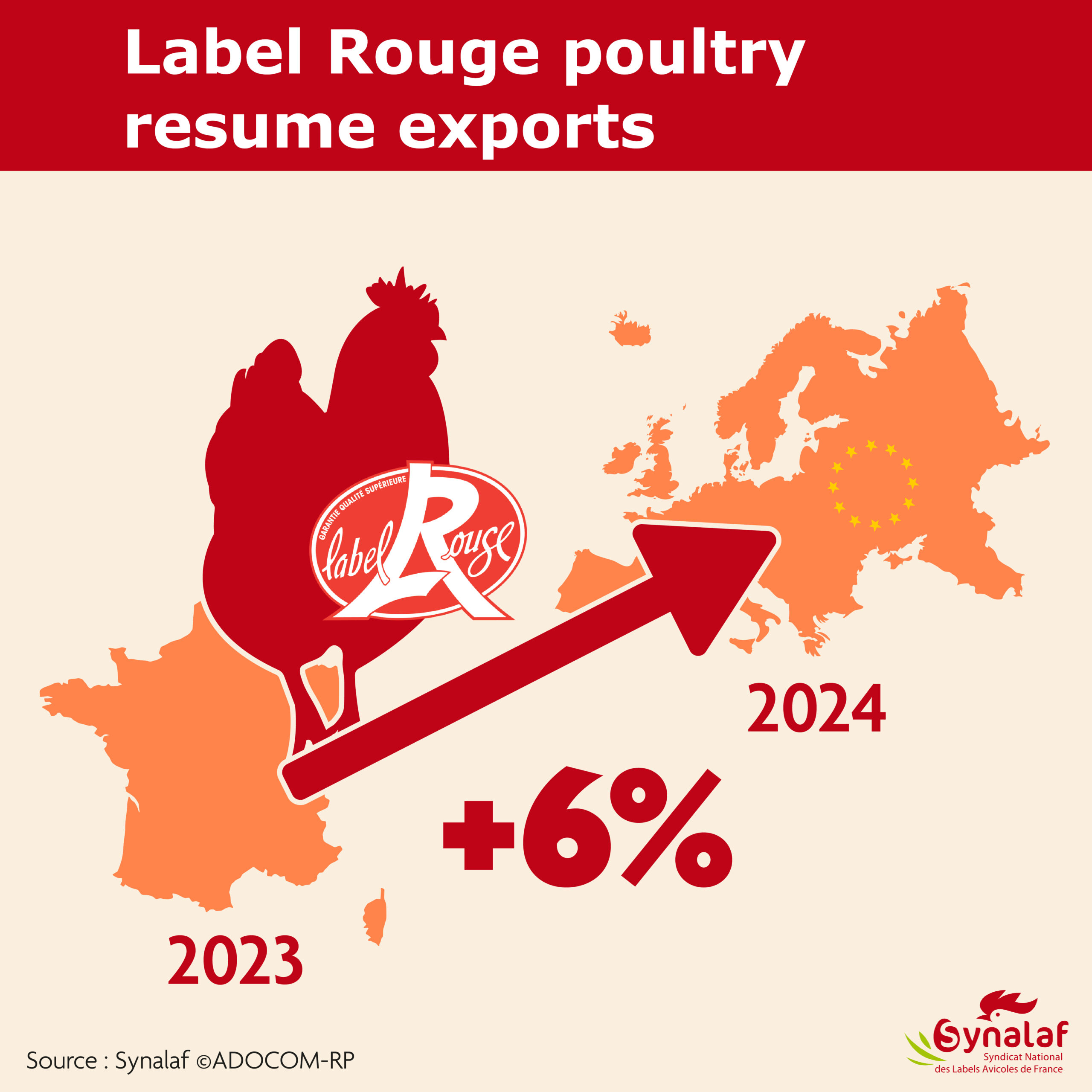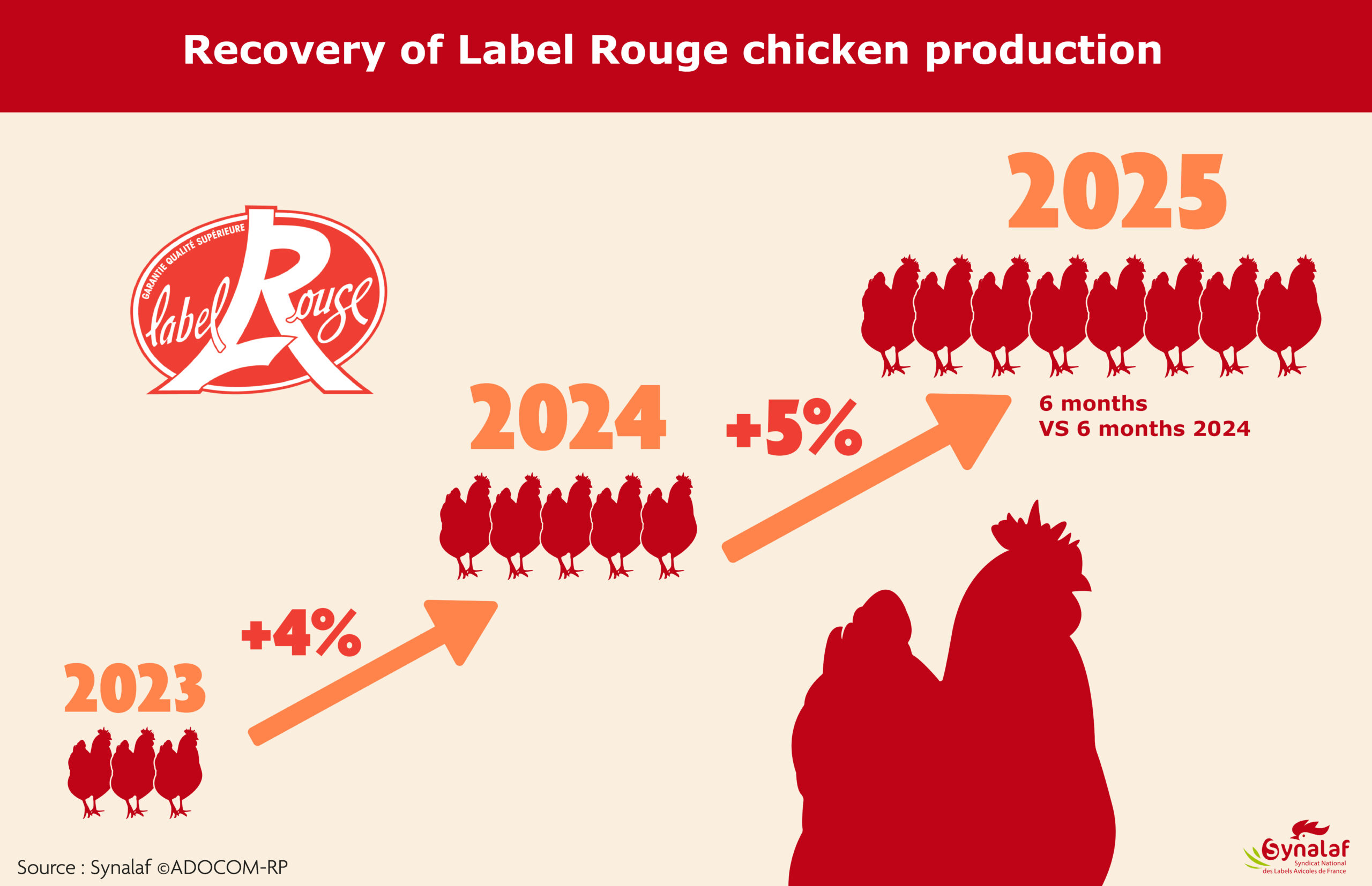 On October 8, 2025, SYNALAF (Syndicat National des Labels Avicoles de France or National Union of Poultry Labels of France) launched a communication campaign in France, Germany, and Belgium, co-financed by the European Union, to remind the fundamental attributes of Label Rouge free-range eggs and chickens. This large-scale information campaign, targeting more than 180 million contacts (consumers and professionals), consists of a three-year action plan that includes radio spots and posters in numerous shopping malls and train stations. It is part of the economic recovery that began in 2024 in the sector. Indeed, figures presented by SYNALAF show a 9.5% increase in egg sales and a 5% increase in Label Rouge free-range chicken sales.