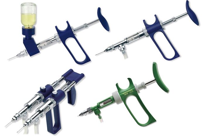 Feed tube and vial holder models are available in fixed versions from 0.2 to 1 mL, with adjustable volumes ranging 0.025 to 10 mL, and as twin models with two independent plungers and barrels covering volumes from 0.25 to 5 mL. The ultra 1810 syringe line delivers highly precise doses from 0.02 to 0.5 mL. A broad selection to cover most needs in fish, poultry, swine, sheep, goat and cattle among other fields.