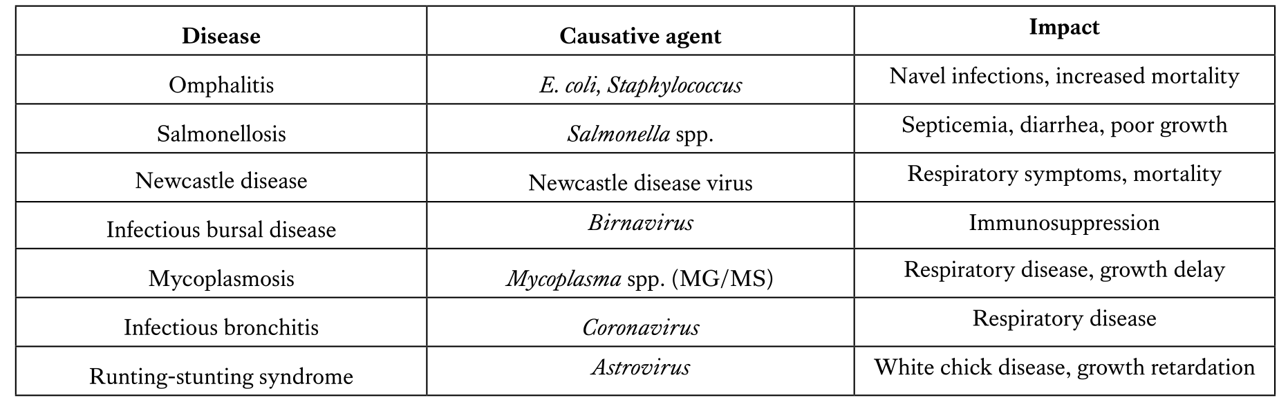 Maintaining a disease-free status is essential for chick vitality and growth. Viral and bacterial diseases commonly affect day-old chicks and must be monitored.