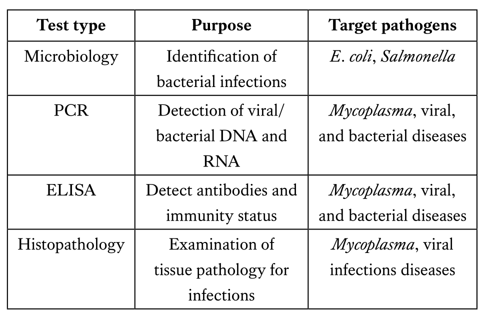Laboratory testing plays a vital role in hatchery quality control, ensuring the health and uniformity of day-old chicks. Among the most important diagnostic tools, the enzyme-linked immunosorbent assay (ELISA) is widely used to evaluate maternal antibody transfer and immune status against critical pathogens such as Newcastle disease virus (NDV), infectious bursal disease virus (IBDV), avian influenza virus (AIV), Mycoplasma gallisepticum (MG), Mycoplasma synoviae (MS), and Salmonella spp. Accurate ELISA results provide insights into breeder vaccination effectiveness and biosecurity performance. Additionally, detecting positive ELISA results or PCR confirmation for Mycoplasma and Salmonella in day-old chicks indicates vertical transmission, signaling serious management failures that can lead to early chick mortality and economic losses. Therefore, integrating serological, molecular, and microbiological testing into hatchery and breeder flock protocols is essential to maintain high-quality chicks, reduce disease risk, and optimize flock performance.