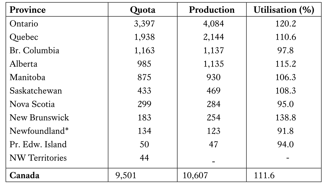 The Farm Products Council of Canada sets the permissible production quotas for the provinces for the following year. The provinces then allocate the quotas to individual farms. The price the farmer receives for each egg delivered is based on the allocated production quota. If the quota is exceeded, the extra eggs must be sold at the prevailing market price. This is usually unattractive, so farmers try not to exceed their quota. However, if there is a shortage in the market supply, e.g. due to an outbreak of avian influenza, it may be attractive to supply eggs to the world market. Table 3 shows that six provinces exceeded their allocated quota, while the others produced less than allowed. In terms of quantity, farmers in Ontario exceeded their quota by 687 million eggs. The highest relative overrun was in New Brunswick at 138.8%. The provincial share of the permitted production quota and egg production is shown in Figure 2. These quotas can be exceeded if special market situations make this necessary. For example, the massive outbreaks of avian influenza in 2023 led to supply shortages. By October 2023, the highly pathogenic virus had appeared on 319 farms. A total of 7.8 million birds fell victim to the disease or were culled as a precautionary measure. Farms were able to use the additional quota of 480 million eggs allowed for such situations. In addition, eggs and egg products were imported from the USA to ensure supply to the population.
