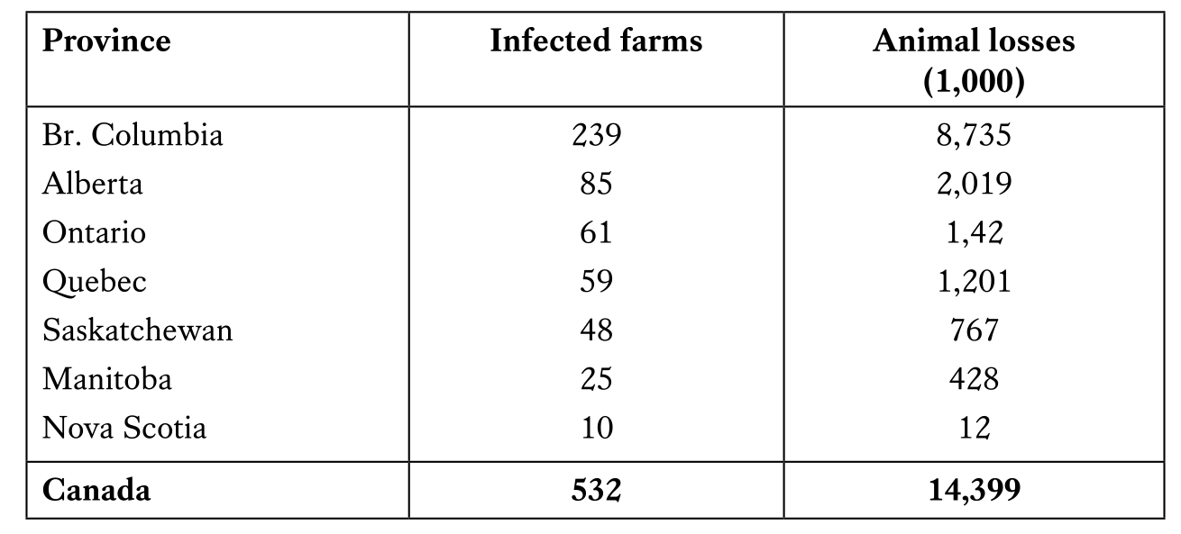 Canadian Food Inspection Agency: Status of ongoing avian influenza response by province. https://inspection.canada.ca/en/animal-health/terrestrial-animals/diseases/reportable/avian-influenza/latest-bird-flu-situation/status-ongoing-response. (Accessed: July 30th 2025)