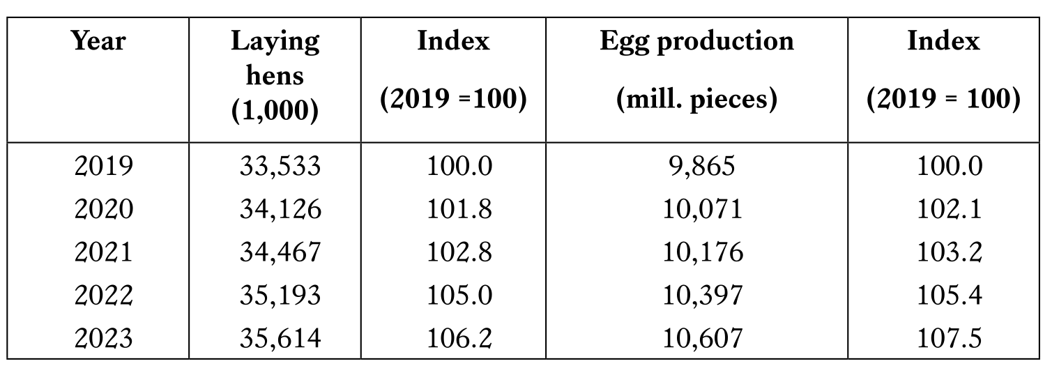 The number of laying hens in Canada increased from 33.5 million to 35.6 million, or by 6.2%, between 2019 and 2023. At the same time, egg production increased by 7.5% (Table 1). The higher rate of growth in egg production was a result of improved average laying performance of hens. The relative increase between 2021 and 2022 was higher than in the other years. This reflects the increased demand for eggs during the Covid-19 pandemic. Eating out decreased because restaurants were closed, and home cooking increased.