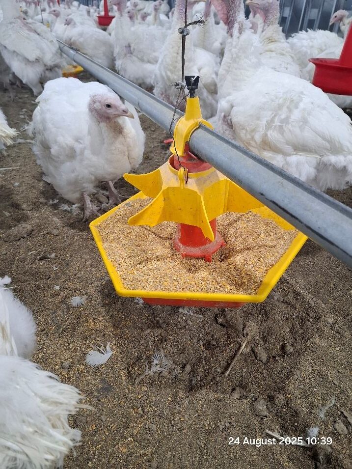 I personally prefer to activate the feeder lines every hour so that fresh feed is distributed properly and fairly to the flock. That would have an extra bonus for us during the broody peak time. The sound of the feeder lines conditions the turkeys, and by starting the feeder lines every hour during the broody peak period, we can somehow encourage the flock to consume as much feed as needed. The more feed is consumed by the fatigued turkeys, the fewer broody birds we will have.