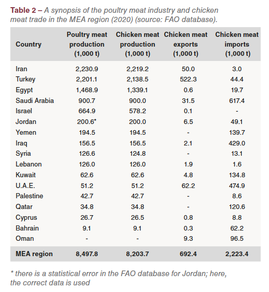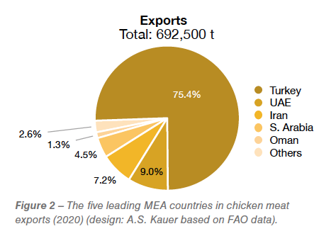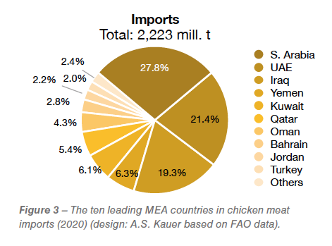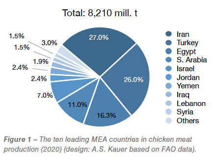 In 2020, 453 million people lived in the 17 MEA countries, 5.7% of the global population. They shared 6.4 % in global poultry meat production and 6.9% in chicken meat production. Their role in global poultry meat trade differed. In 2020, they shared 12.1% in global chicken meat imports and contributed 4.8% to chicken meat exports. Trade with other poultry meat species was negligible. The specific climatic situation, which limits the production of poultry feed, explains their remarkable role in chicken meat imports. The extraordinary role of poultry meat in the nutrition of the MEA countries results from the lack of religious barriers regarding the consumption of this meat type.