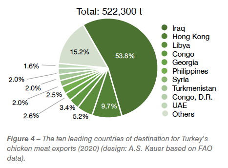 In 2020, Turkey ranked in fifth place among the leading chicken meat exporting countries with a share of 3.6% in the global export volume. Chicken meat was exported to 100 countries; the regional concentration was however very high as Figure 4 documents. With a share of 53.8%, Iraq was the leading country of destination, followed by Hong Kong, Libya and Congo. The composition and ranking of the countries reflects the possibility to deep freeze chicken meat and, in contrast to shell eggs, to transport it over long distances.
