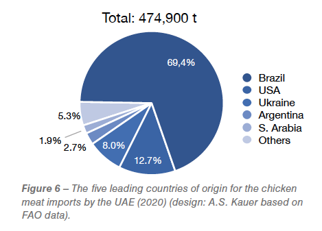 A comparison of the trade flows in poultry meat imports reveals that Brazil was the leading country of origin for all countries on the Arab Peninsula. The USA, number two in global broiler meat exports, gained higher market shares only in the United Arab Emirates, which, based on the specific composition of the population and its international economic relations, imported considerable amounts of cut up parts to meet the consumer demand.