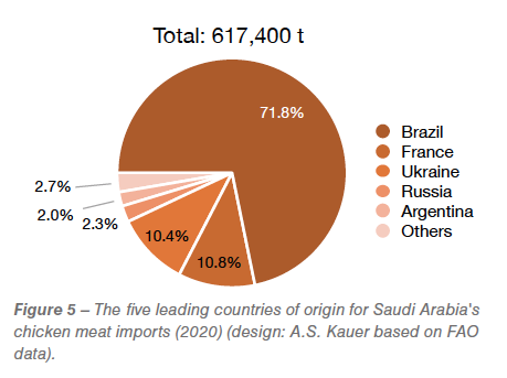 The five leading countries of origin contributed 97.3% to the overall imports, Brazil alone 71.8%. The extraordinary role of Brazil is not surprising as it is the leading chicken meat exporting country. It is surprising, however, that the USA did not export similar quantities to Saudi Arabia. One reason may be the aftermath of the Avian Influenza outbreaks in the USA in 2015, which stopped exports to over 30 countries. Another reason is that the consumers on the Arab Peninsula prefer whole broilers with an average weight between 0.8 and 1 kg as a meal. While Brazil and France offer this product, the USA mainly exported cut up parts, which are not very attractive for the consumers (Windhorst 2019, 2021).