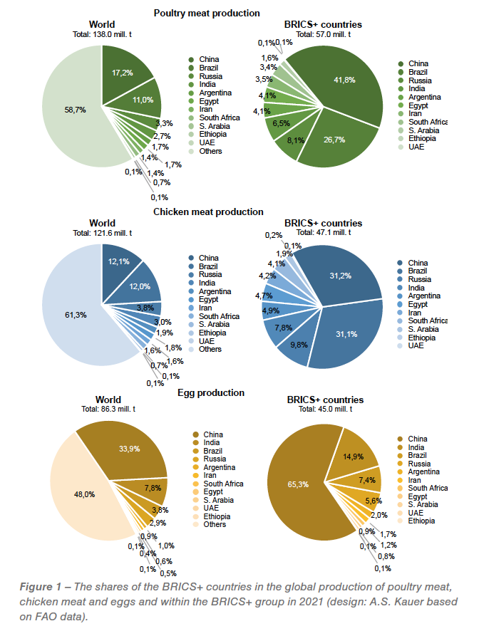 A comparison of the shares of BRICS+ in world production of poultry meat and eggs with those of the EU (27) and the USA in 2021 shows the strong position of the group (Table 2).