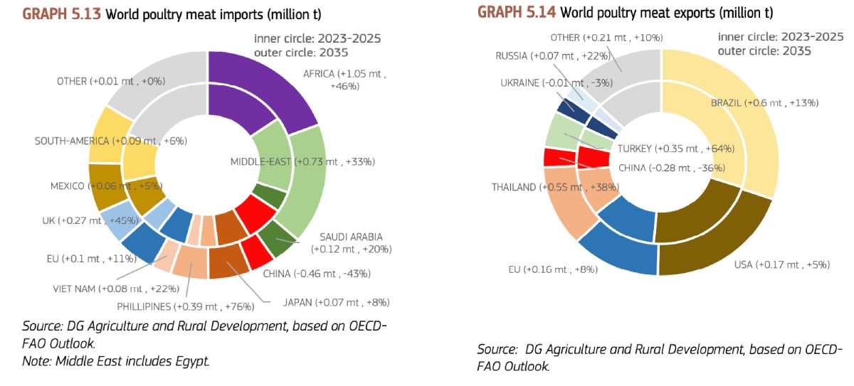 Global import demand for poultry meat is expected to increase by 2.5 million tonnes by 2035, driven mainly by growth in the Middle East, Africa and Asia. Following a period of decline, EU poultry exports are projected to regain momentum, growing at an average rate of +0.8% per year to reach more than 2.1 million tonnes by 2035.