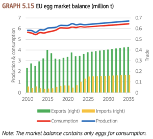 Between 2015 and 2025, EU egg production grew by an average of +0.8% per year. Over the 2025–2035 outlook period, egg production is projected to continue increasing, but at a slower average annual rate of +0.5%.