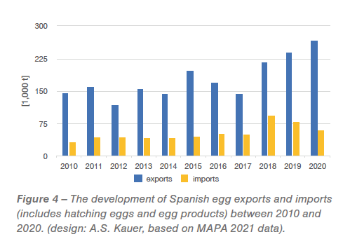 Including hatching eggs and shell egg equivalents for egg products, the overall export volume increased from 144,300 t in 2010 to 266,300 in 2020 or by 84.5%. Figure 4 shows the considerable fluctuation during the transformation of the housing systems. Imports reached their highest value in 2017 with over 92,000 t and declined to only 58,600 t in 2020.