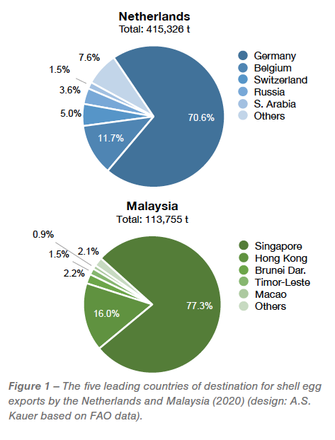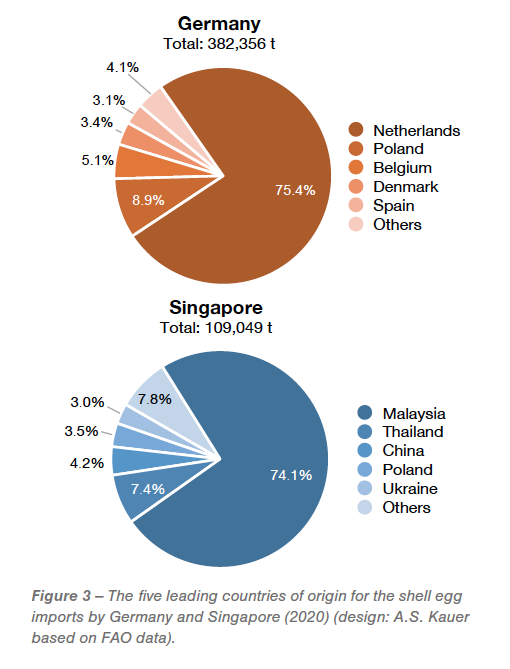 One country of destination (Germany respectively Singapore) was in an unchallenged top position. It is obvious that the short distance between the exporting respectively importing countries played an important role in the pattern of the trade flows. With increasing distance, the export volumes decreased considerably. While Germany’s self-sufficiency rate for egg demand was about 70%, it was almost zero for Singapore. Because of the limited available space for barns and the problems of manure disposal, Singapore decided to give up animal production. Completely depending on imports, the government decided to invest in the development and production of alternative proteins to reduce the dependency.