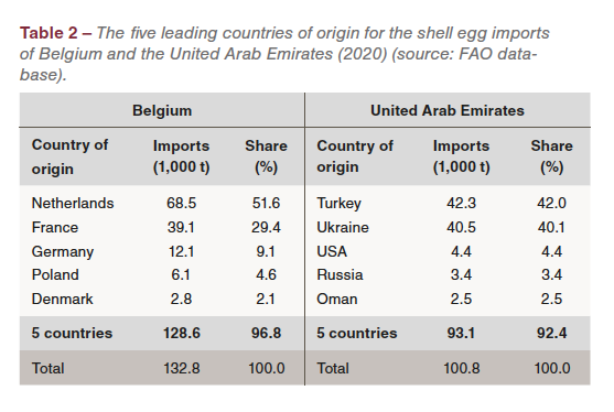 Two countries with a high regional concentration of their imports in 2020 were also Belgium and the United Arab Emirates. Table 2 shows that both countries imported over 80% of their shell eggs from only two countries. Distance was obviously the main steering factor behind Belgium’s imports from the Netherlands and France. For the United Arab Emirates, the closest countries with a high egg surplus were Turkey and Ukraine. Despite the considerable distance, it was possible to transport the eggs by truck.