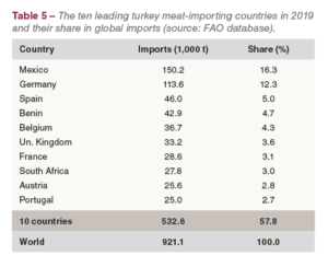 The regional concentration in imports was much lower. The ten leading turkey meat-importing countries only shared 57.8% in the global import volume, the top two, Mexico and Germany, together 28.6%. A comparison of the composition and ranking of the countries listed in Tables 3 and 4 reveals that turkey meat was mainly traded between European and American countries. Two African countries, Benin and South Africa, ranked among the leading importing countries in 2019. Benin imported turkey meat from 27 countries, with the USA, Brazil, France, Spain, Germany and Italy as the main countries of origin. Part of the imports was exported to other African countries. South Africa imported turkey meat from the USA, Brazil, Canada, Chile, Poland and Spain. At first sight it is surprising that Germany was listed as a leading exporting and an importing country. In 2019, Germany exported turkey meat to over 70 countries, mainly to other EU (27) member countries, but also to Benin and Hong Kong. On the other hand, it imported meat from 23 countries, with Poland, France and Italy as the leading countries of origin. The close trade relations with Poland are a result of the activities of the leading German poultry meat producer in Poland. Similar to chicken meat, high-value parts were imported and low-value parts exported.