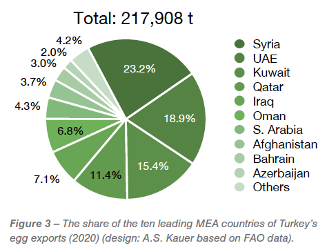 The ranking of the countries according to their egg production reflects, as was to be expected, that of the laying hen inventories (Figure 2). There is one deviation, however, Israel. Israel’s production is much higher than that of Kuwait despite their almost identical inventories. Obviously, there is a statistical error for Jordan, as the production volume is incorrect in the database. In 2020, the average laying rate in Israel was 267eggs per hen and year. In Turkey and Egypt, the efficiency was considerably lower with 167 egg respectively 215 eggs. While in Israel only hybrid hens were kept in battery systems, in most other countries beside such efficient breeds and housing systems, small backyard flocks with regional breeds were also in production. A comparison of the countries’ shares in the total laying hen inventory and in egg production reveals the differences in the efficiency of the production systems.