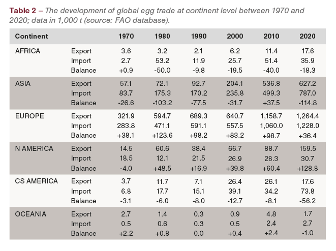 Table 2 provides an overview of the development of egg exports and imports and the trade balance at continent level.