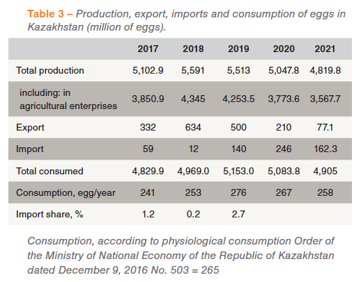 Currently, there are 67 large and small poultry farms in the Republic of Kazakhstan, of which 35 are for egg, 25 for meat and 7 for breeding (Table 1).
