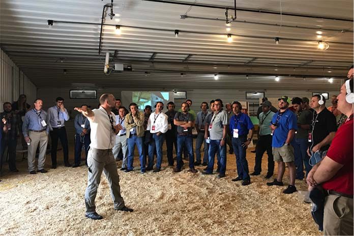 Cobb technical service experts and NPTC staff spoke with attendees about various aspects of ventilation in the poultry house, including types of ventilation, fan shade and evaluation, tightness, and house design. Workshop leaders provided this information through lectures and hands-on training, including smoke, water and heater demonstrations.