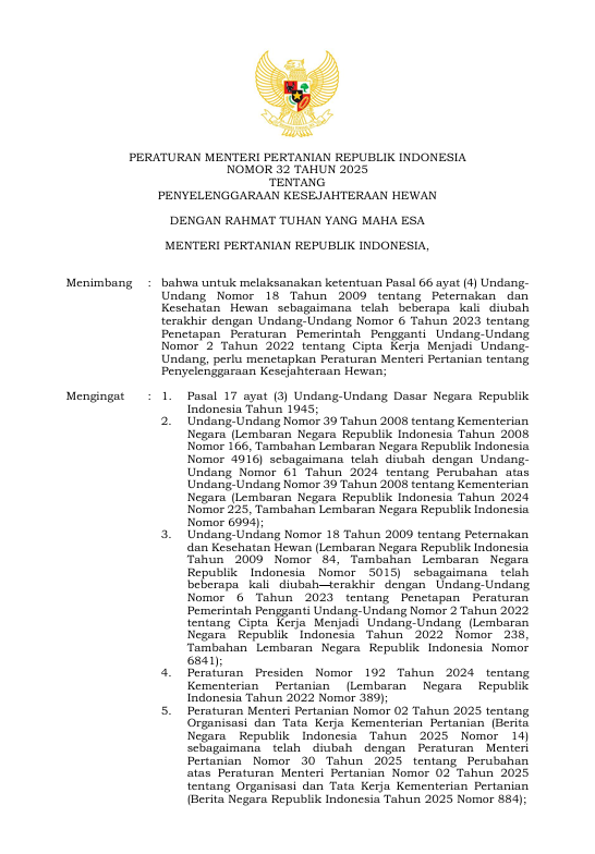 Jakarta – The Government of Indonesia has officially issued Minister of Agriculture Regulation (Permentan) No. 32 of 2025 on the Implementation of Animal Welfare. This regulation serves as a key legal foundation to ensure that livestock management practices are aligned with animal welfare principles. In addition, it supports poultry production systems that meet animal welfare standards, including cage-free egg production systems.